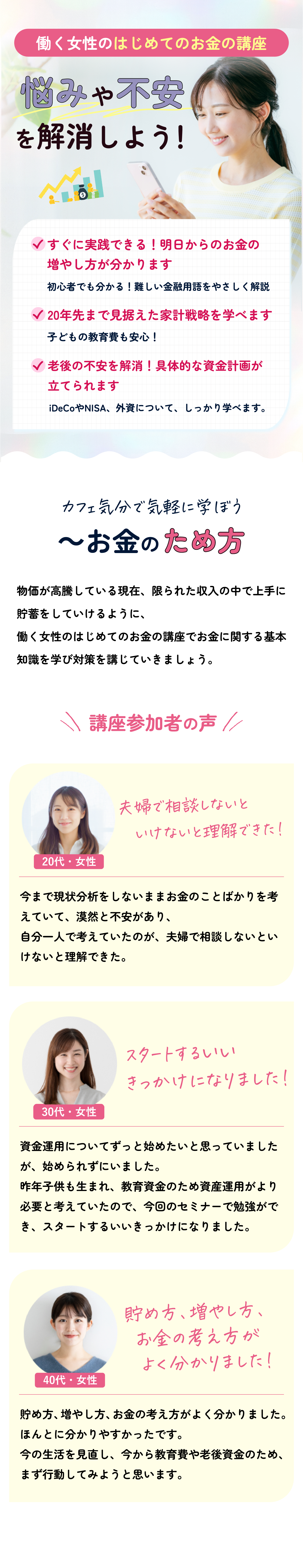 多くの方が今抱える「老後資金」「年金対策」「相続」の課題に寄り添い、「お金の悩みは早めの準備で解決できる」という信念のもと、わかりやすく具体的な講座を心がけています。